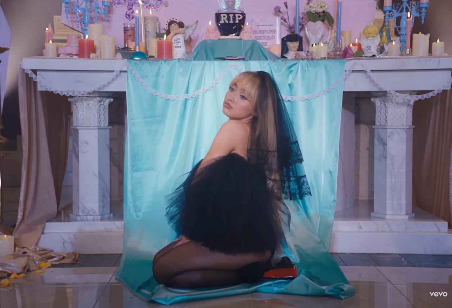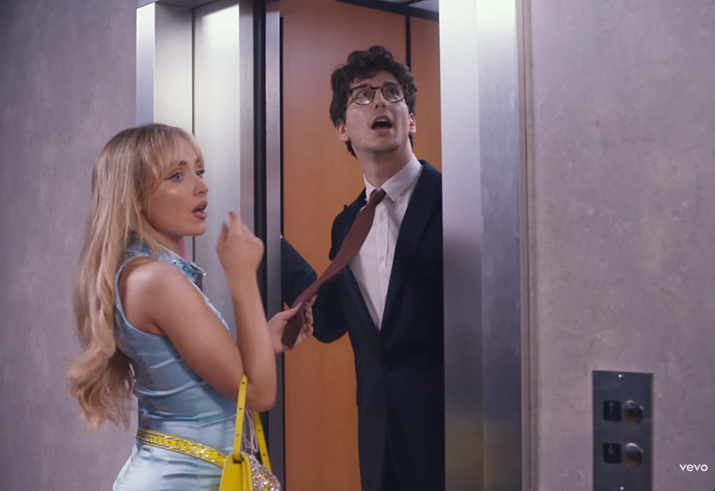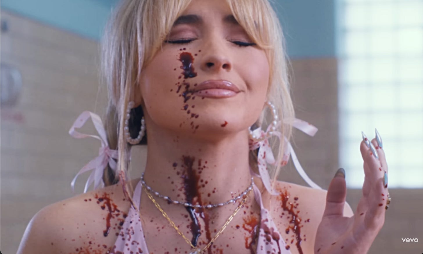 The song-video continues, and now we see Sabrina in a tightly-fitted, bright-blue corset in an elevator. A man in a suit takes photos of her behind, she catches him, and laughs in a deep voice, “I’m so sorry for your loss.” Sabrina takes him by the tie so as to lead him on, exits, and pins his tie in between the elevator doors—“you’re a waste of time”—and kills him, blood oozing down. And she “feels like a feather” with these men “out of [her] life.”