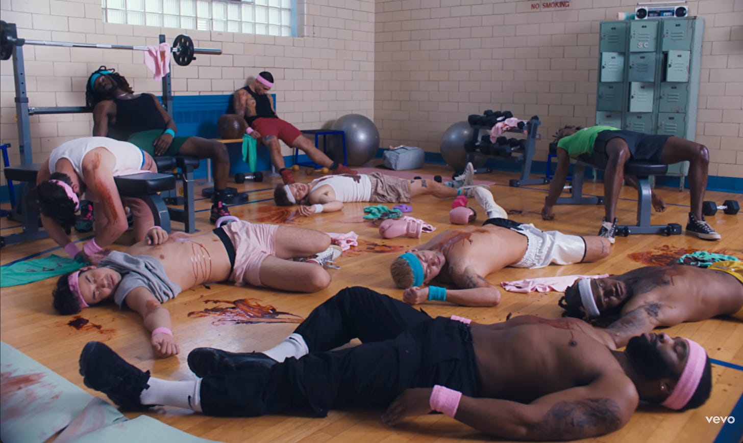 In the next scene, we see Sabrina in a gym dressed like a “cheerleader” out of a porno—knee-high socks, athletic shorts, cleavage and stomach-revealing pink one-piece, and of course pigtails—taking cute selfies, surrounded by men. They end up banally fighting each other, but ultimately, none of them “gets” her. Instead, these men all kill each other, as blood in bukkake-esque fashion spatters across Sabrina’s face and chest.